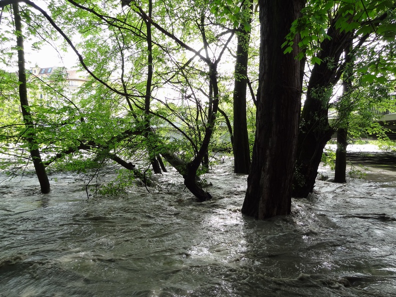 L'Arve en furie, sous le pont de Carouge, le plus vieux de Genève et l'un des seuls à être resté ouvert durant la crue.