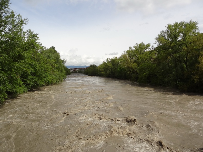 La crue menace le pont des Acacias, atteignant le sommet des piliers.