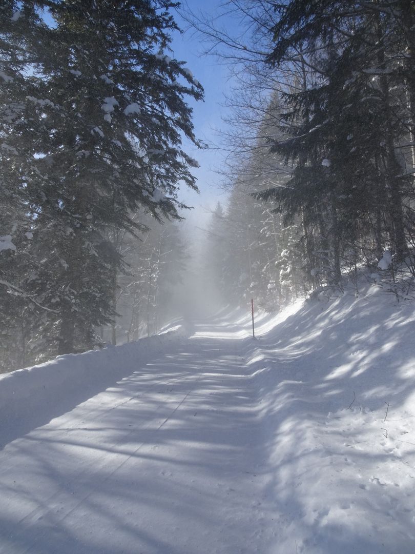 Les rafales de bise soulèvent la neige jusque dans la forêt