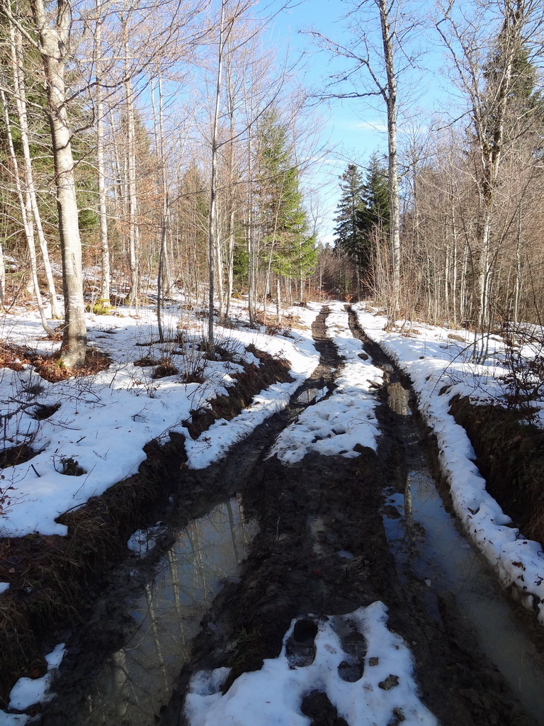 Jura Bike transformée en bourbier marécageux par les machines des forestiers et la fonte de la neige